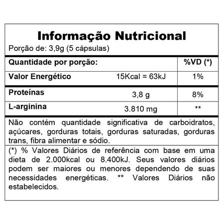 Porção: 5 cápsulas = 3.810 mg de L-Arginina
