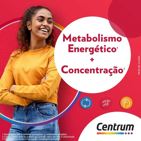 Centrum Energia Corpo & Mente é um suplemento multivitamínico adulto desenvolvido para apoiar o metabolismo energético, aumentar a vitalidade e contribuir para o foco e concentração.
