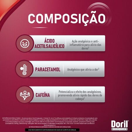 SE PERSISTIREM OS SINTOMAS, O MÉDICO DEVERÁ SER CONSULTADO. NÃO USE ESTE MEDICAMENTO EM CASO DE GRAVIDEZ, GASTRITE OU ÚLCERA DO ESTÔMAGO E SUSPEITA DE DENGUE OU CATAPORA.. NÃO USE JUNTO COM OUTROS MEDICAMENTOS QUE CONTENHAM PARACETAMOL, COM ÁLCOOL, OU EM CASO DE DOENÇA GRAVE DO FÍGADO. DORIL ENXAQUECA 8 COMPRIMIDOS É UM MEDICAMENTO. SEU USO PODE TRAZER RISCOS. PROCURE UM MÉDICO E O FARMACÊUTICO. LEIA A BULA.
