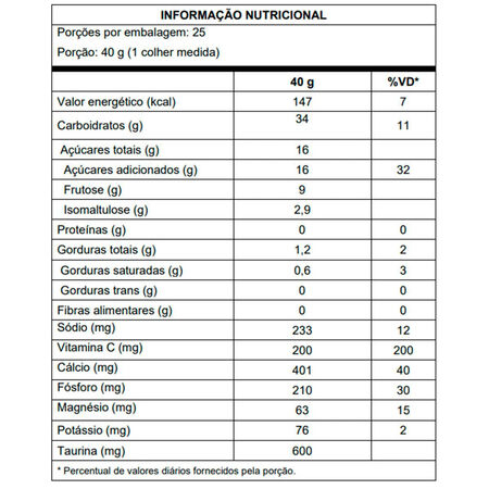 Além disso, o produto fornece 200mg de vitamina C por porção, taurina e os principais eletrólitos (sódio, cálcio, potássio e magnésio) para auxiliar na reposição de minerais perdidos no suor e na prevenção de cãibras e fadiga muscular. Tudo isso com um sabor leve e agradável de laranja.