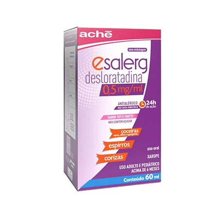 Esalerg é um medicamento indicado para aliviar os sintomas da rinite alérgica, como espirros, coriza, coceira e congestão nasal, além de tratar coceiras na pele, como urticária. Com início de ação em apenas 30 minutos e efeito que dura até 24 horas, Esalerg não provoca sonolência e não interage com outros medicamentos ou alimentos, sendo uma solução prática para o uso diário. Disponível em formato de xarope sem açúcar e com sabor tutti frutti, o frasco de 60 mL é ideal para quem busca uma opção compacta e fácil de transportar, atendendo tanto crianças a partir de 6 meses quanto adultos. A desloratadina, substância ativa do Esalerg, bloqueia a ação da histamina, proporcionando alívio rápido e eficaz dos sintomas alérgicos. A embalagem vem acompanhada de uma seringa dosadora, garantindo uma administração precisa.