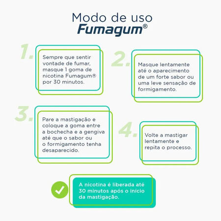 Ao ser mastigada, a goma libera nicotina de forma controlada, aliviando rapidamente os sintomas da abstinência e reduzindo a vontade de fumar. Fumagum® é uma opção conveniente e segura para quem busca uma terapia de reposição de nicotina (TRN) eficaz, podendo ser utilizada em locais onde fumar é proibido.