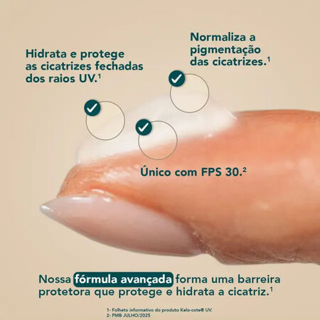 Kelo-Cote é um gel hidratante com proteção UV (FPS 30) e tecnologias crosslink e siliclear complex. Ele conta com uma fórmula sem parabeno e formato gel transparente e autossecante feito 100% em silicone.