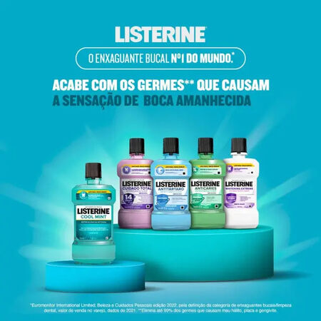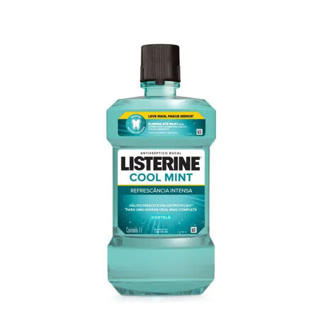 O Listerine Cool Mint Refrescância Intensa é um antisséptico bucal que oferece proteção 24h contra germes que causam placa, tártaro, gengivite e mau hálito. Com sabor de hortelã refrescante, elimina até 99,9% dos germes, proporcionando hálito fresco e sensação de limpeza prolongada.