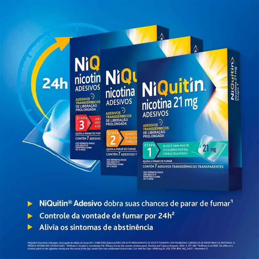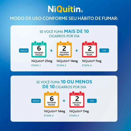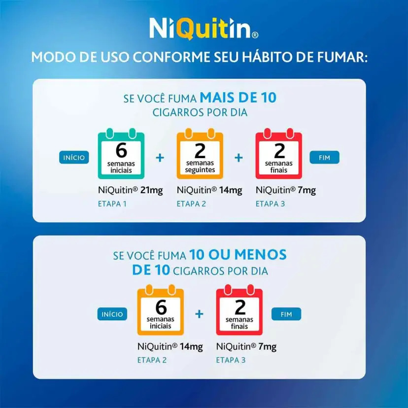 NiQuitin® é um adesivo transdérmico de nicotina indicado para auxiliar fumantes que desejam parar de fumar. Ele atua reduzindo gradualmente os sintomas da abstinência, como ansiedade, irritabilidade e o desejo intenso pelo cigarro, facilitando o processo de cessação do tabagismo.