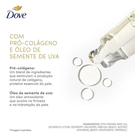 O Dove Óleo Sérum Corporal Firmador é um tratamento inovador que combina o poder do pró-colágeno e do óleo de semente de uva para proporcionar hidratação intensa por até 24 horas, firmeza e elasticidade visíveis. Sua textura leve e de rápida absorção deixa a pele macia, iluminada e sem sensação pegajosa.