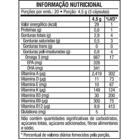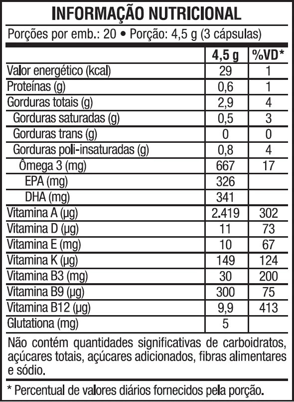 • Ômega 3: essencial para o organismo, muitas vezes insuficiente na alimentação. Sua suplementação auxilia na redução de eventos cardiovasculares e na saúde a longo prazo¹²³.