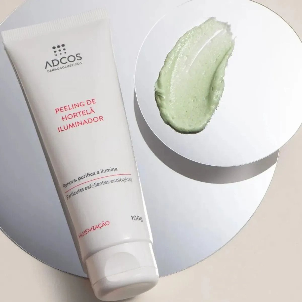 Adcos Clean Solution Peeling de Hortelã Iluminador (100g): renovação, luminosidade e frescor para uma pele uniforme, revitalizada e com toque macio desde a primeira aplicação.
