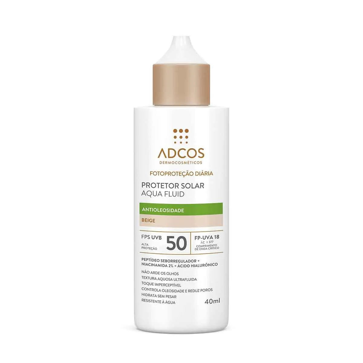Adcos Protetor Solar Facial Aqua Fluid FPS 50 – Cor Beige (40 ml): proteção intensa, controle da oleosidade e acabamento leve para uma pele uniforme, saudável e com toque seco o dia todo.