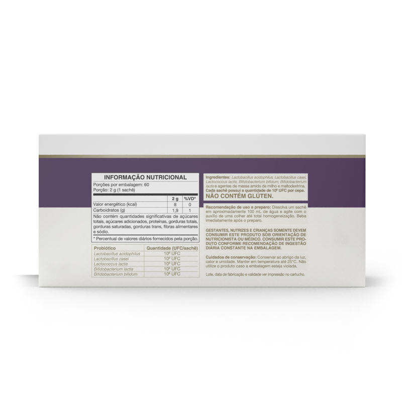 Os Lactobacillus acidophilus, Lactobacillus casei, Lactococcus lactis, Bifidobacterium bifidum e Bifidobacterium lactis contribuem para o equilíbrio da flora intestinal, promovendo bem-estar e auxiliando o bom funcionamento do trato gastrointestinal.