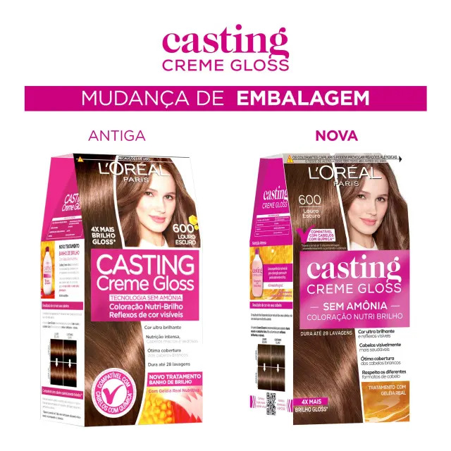 O Casting Creme Gloss 600 Louro Escuro, da L’Oréal Paris, é uma coloração semipermanente sem amônia, indicada para todos os tipos de cabelo, inclusive os quimicamente tratados. Sua fórmula exclusiva conta com o tratamento Banho de Brilho com Geleia Real, que proporciona até 4x mais brilho gloss, reflexos intensos de cor e nutrição profunda, deixando os fios macios, aveludados e sem ressecamento.