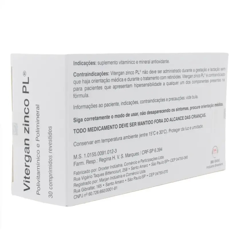 Vitergan Zinco PL é um suplemento vitamínico mineral antioxidante, formulado para restaurar a imunidade e auxiliar na proteção contra infecções. Sua composição em dose única diária combina zinco, vitamina C, vitamina E, betacaroteno (pró-vitamina A), cobre e selênio, contribuindo para o equilíbrio do sistema imunológico e o combate ao excesso de radicais livres. Indicado para adultos que buscam suporte nutricional e fortalecimento da defesa natural do organismo.