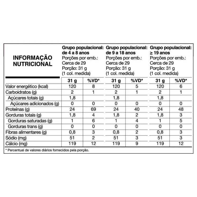 Proteína de soro do leite concentrada (Whey Protein Concentrate – WPC), proteína de soro do leite isolada (Whey Protein Isolate – WPI), aromatizante artificial, espessante goma xantana e edulcorantes acessulfame K e sucralose.